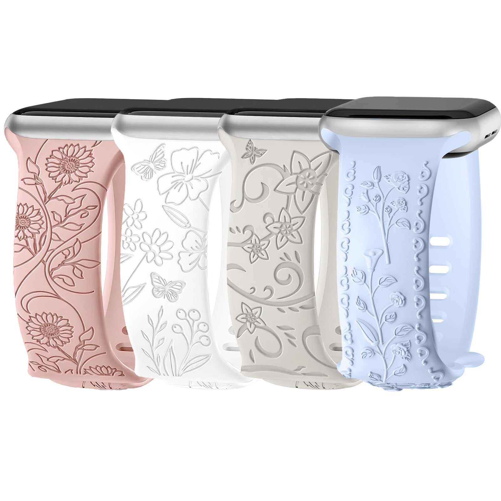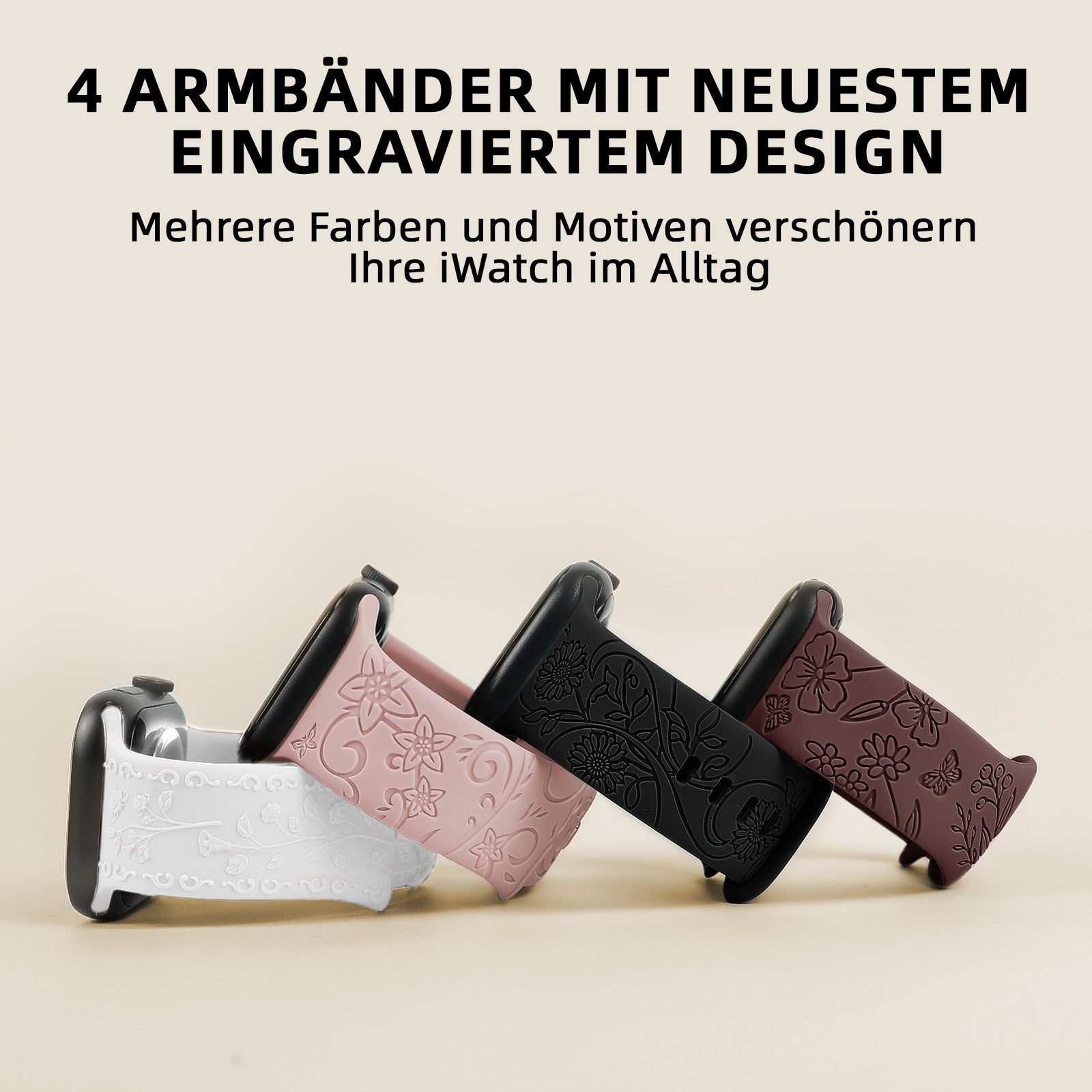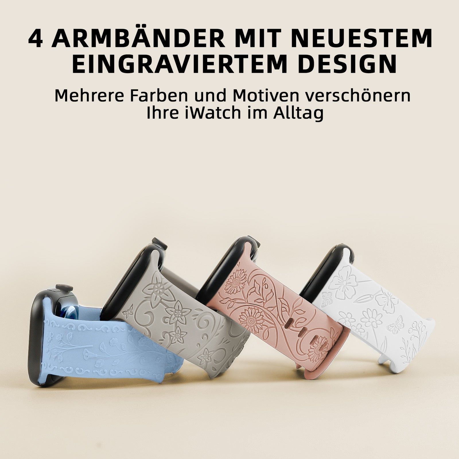 Dieses 4er-Pack floraler Silikon-Armbänder ist der feminine Upgrade für Ihre Apple Watch – weich, wasserdicht, hautfreundlich und kompatibel mit allen Modellen 42/44/45/49 mm, Serie 4–10, SE1-2, Ultra 1-2). Die zarten Blumenmuster in Pastell & Naturfarben machen jedes Outfit zum Hingucker – von Sport bis Date!