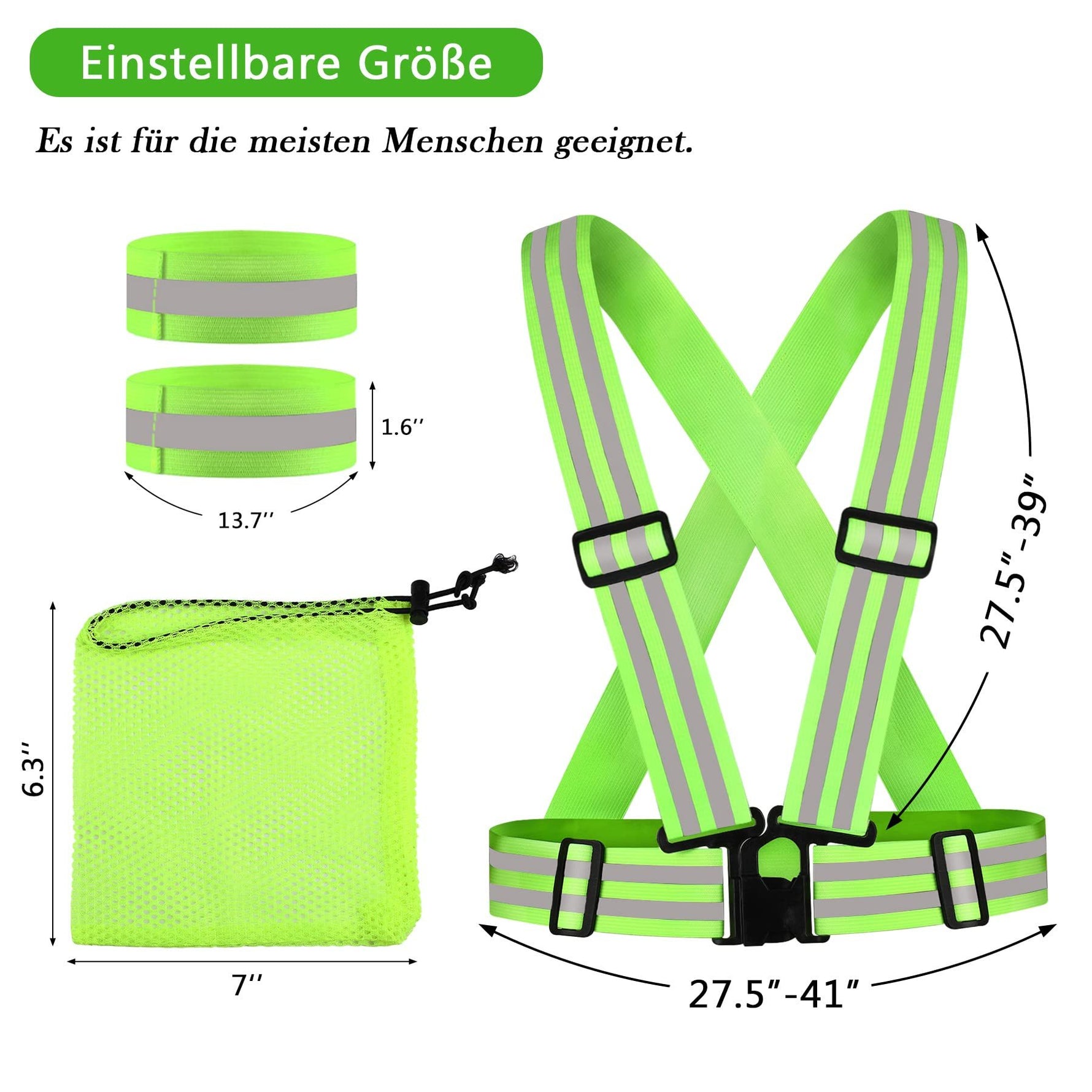 - Inhalt: 2 Warnwesten, 4 Armbänder, 1 Beutel.