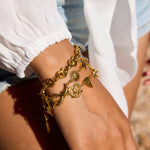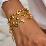Sublimez votre look avec notre bracelet à motif doré pour femme ! Fabriqué en acier inoxydable de haute qualité avec une finition dorée brillante, ce bracelet séduit par son design géométrique, orné de motifs étoiles et cœurs. Idéal au quotidien, pour les grandes occasions ou comme cadeau. Portez-le seul pour un éclat subtil ou superposez-le pour un look tendance.